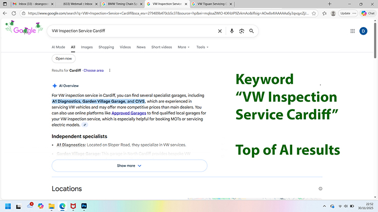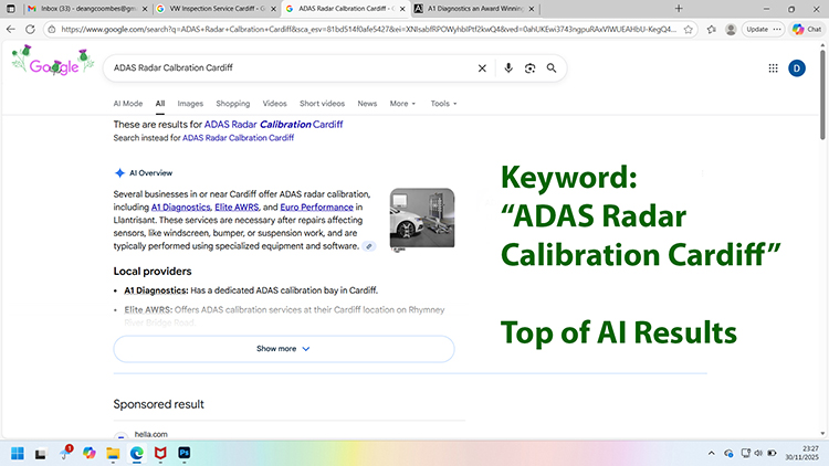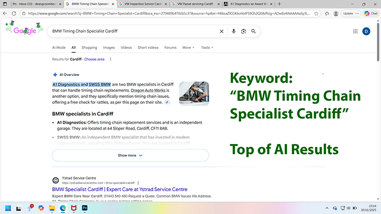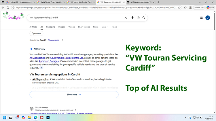 ![]() 18th November 2025 Dean manages A1 Diagnostics Cardiff Business Award nomination and win! We have great news to report. A1 Diagnostics have won this year's "Innovation Business of the Year Award" at the prestigious Cardiff Business Awards 2025. Here is Rishi (Managing Director, A1 Diagnotics) picking up the award at the ceremony: ![]() We managed the award from start to finish. We wrote the award application and submitted it to the judging body. Dean also went in front of the judging panel and answered every question on why A1 Diagnostics deserved to win the award for "Innovation Business of the Year" in 2025. Here are the judges names and a short description of who they are: Jessica Leigh-Jones MBE ![]() Jessica Leigh-Jones, MBE, award-winning engineer, entrepreneur, and champion for skills and innovation, as Chair of Judges for the Cardiff Business Awards 2025. Liz Brookes of Grapevine Event Management ![]() Liz founded Grapevine Event Management in March 2011 and it is now one of the most well recognised corporate events companies in Wales delivering high quality creative and innovative events. Liz created Cardiff Business Awards in 2015; speaking about the awards Liz has said “the levels of success, ambition and achievement being shown by so many firms in Cardiff continues to cement the city’s place as a leading commercial centre for the UK.” Warren Lewis, Former Head of Corporate Banking, Wales ![]() With 35+ years in banking- including as Head of Corporate Banking, Wales- Warren now advises leaders on growth, ESG, and international expansion. As Chair of the Cardiff Capital Region Business Climate Coalition, he’s passionate about helping businesses pivot to net zero. Ken Poole MBE - Head of Economic Development at Cardiff Council ![]() Ken leads Cardiff’s economic strategy, works with top businesses to bring investment to the city, and drives major regeneration projects shaping the future of Cardiff and the region. He also champions Cardiff on the UK and global stage. Agnes Xavier-Phillips JP DL ![]() A highly accomplished solicitor and former General Counsel of GE Capital London, Agnes brings a wealth of expertise to the panel. Her portfolio includes Cardiff University, Welsh Water, CBC and FFIN Dance. She also serves as a Justice of the Peace, Deputy Lord-Lieutenant of Gwent, Freeman of the City of London, and Master of the Welsh Livery. Paul Hoop ![]() Paul is CEO and former Co-Founder of Hoop Recruitment, one of Wales’ largest independent specialist recruitment consultancies. With nearly 20 years’ experience in leadership and talent management, he has guided Hoop through its transition to Employee Ownership in 2024, earning accolades including Cardiff Business of the Year, Financial & Professional Service Business of the Year, and Employer of the Year. The benefits of winning an award like this from a digital marketing perspective We come up with the strategies to help our clients stay ahead. The search industry is constantly changing and it is ever important to ensure you protect clients from changes in Google algorithms and from new players in search like Chat GPT. Winning this award allowed us to be mentioned in the media countless times, and on websites that have real standing with Google, and platforms like Chat GPT. This award helped us gain more AI listings and increased traffic to the A1 Diagnostics website sharply. Here are examples of listings: ![]() ![]() ![]() ![]() Traffic increased on the A1 Diagnostics website by 40% from receiving the news we had been nominated for an award at the Cardiff Business Awards, and spiked a further 25% after winning the award. Traffic then leads to more sales revenue, safeguarding the garage when it comes to digital for a long time to come. What do A1 Diagnostics say about Dean's work? Here is a video testimonial provided by the Managing Director of A1 Diagnostics, Rishi Patel: |